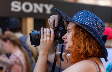 August 18, 2018. Moscow, Russia. A girl in a blue hat takes pictures with Sony's company camera.