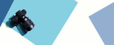 Male photographer taking picture with professional camera outdoors, space for text. banner design