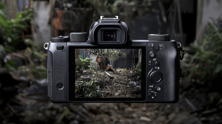 A modern camera displays a vibrant wilderness scene on its screen, showcasing technology and nature's beauty, perfect for photography enthusiasts.