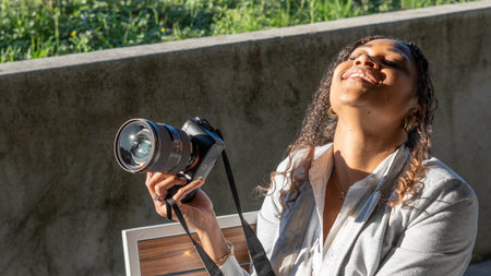 Woman with camera outdoors. Girl takes pictures. Hobby, leisure or profession
