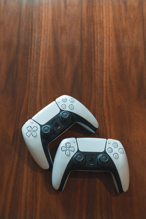 London, UK - May 25, 2021: Two Playstation 5 (PS5) controllers on a wooden table. Playstation 5 is the latest video game console by Sony released in November 2020 as a successor to the PlayStation 4.