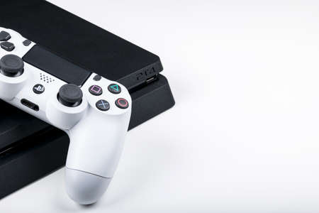 Sankt-Petersburg, Russia, May 20, 2017: Sony PlayStation 4 game console with a white joystick dualshock 4 on white background, home video game console taken in Sankt-Petersburg on May 20, 2017