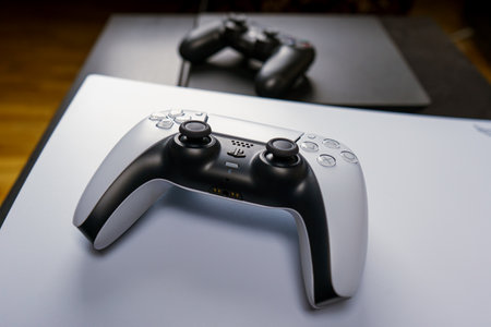 London, UK - May 25, 2021: Playstation 5 (PS5) controllers on a table, copy space. Playstation 5 is the latest video game console by Sony release in November 2020 as a successor to the PlayStation 4.