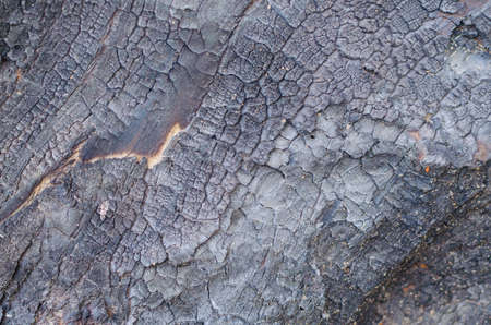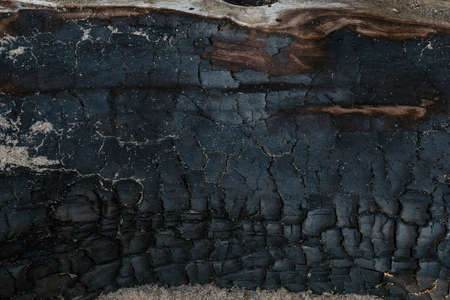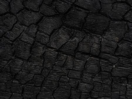 Background, black charred timber, coal after fire, abstract and in cracks of charcoal.