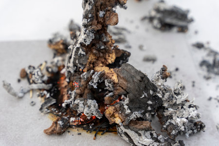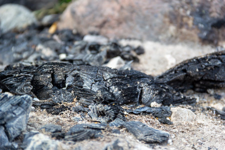 Scattered pieces of blackened wood can be seen on a rocky surface, indicating the aftermath of a fire. The area shows signs of destruction with ash and charcoal present.