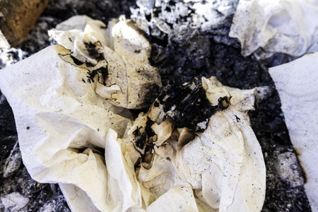 Dark grey ashes and small chunks of burnt charcoal wood lie scattered across the rough texture of a coarse brown burlap sackcloth fabric illuminated by dramatic directional lighting from the side.