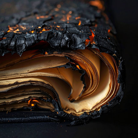 A close-up of a charred book, its pages curled and glowing with the last embers of a fire.