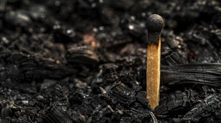 A collection of matches stands upright on a dark surface, with smoke rising from their tips. The striking heads are charred, highlighting an interesting contrast with the wooden stems and the surrounding ash.