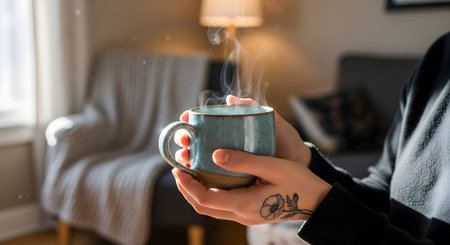 A person with a flower tattoo on their hand holds a steaming, handmade ceramic mug in a cozy, sunlit room. This hygge-inspired image evokes feelings of comfort, warmth, and relaxation at home.