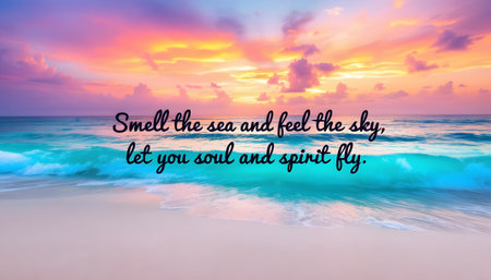 Peaceful ocean sunset scene with inspirational quote. Beautiful beach, vibrant colors