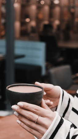 Female hand holding a cup of coffee in a cafe, stock photo