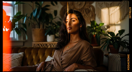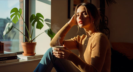 A young woman sitting comfortably in a cozy living room with warm sunlight