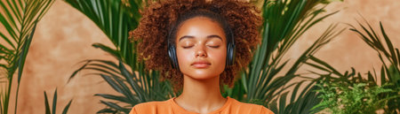 A woman relaxes in a cozy chair wearing headphones while enjoying tranquil moments in a sunlit room surrounded by greenery