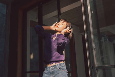 A captivating close-up of a young woman with headphones, lost in the joy of music. Her natural beauty shines through as she expresses happiness and relaxation in an urban setting.