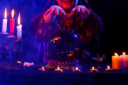 woman fortune-teller guesses the future with a magic glass ball.