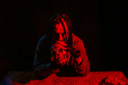 Young man with skull over dark background