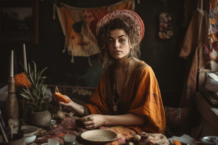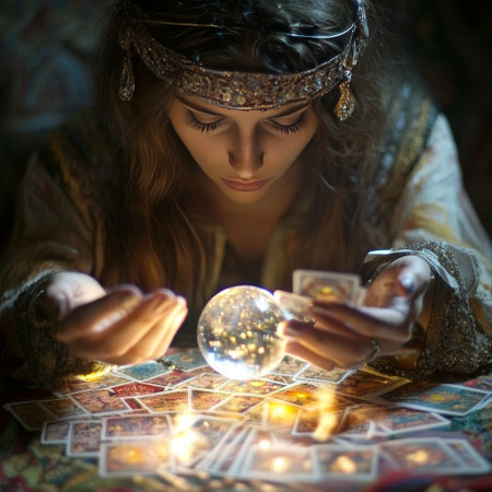 A woman with long dark hair and jewelry adorns her neck and wrists, gazes intently into a crystal ball. Surrounded by candles and a colorful rug, she embodies a mystical and spiritual atmosphere.