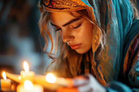 Woman fortune-teller guesses fate of night at table with candles
