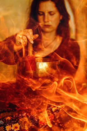 A woman holds a tibetian bowl, connecting the elemental forces of water and fire in an ethereal union, evoking transformative rituals.