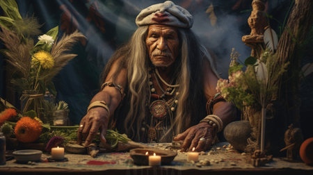 Native American medicine man performing healing ritual with reverence