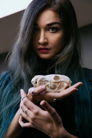 Portrait of a young girl holding a mysterious skull in the hands of a fox. Painted long hair.