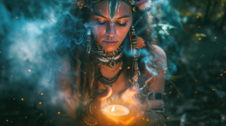 Indian shaman woman adorned with colorful feathers, who appears to be deeply inspired and engaged in an ayahuasca ceremony