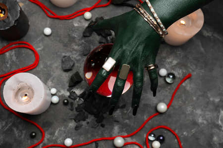 Evil witch with crystal ball at table