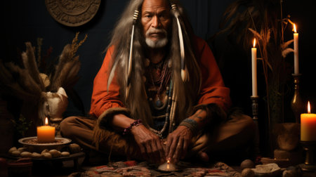 A man with long hair sitting in front of candles, AI