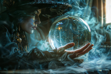 Bewitching fortune teller woman reading future on magical crystal ball.