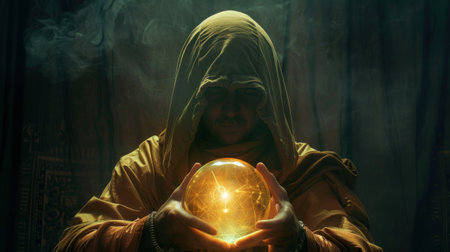A wizard holding a crystal ball with a glow. The image has a mystical and magical feel to it
