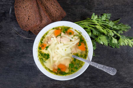Homemade chicken soup with noodle in the white bowl with spoon, beside brown bread and parsley on the black surface, top view