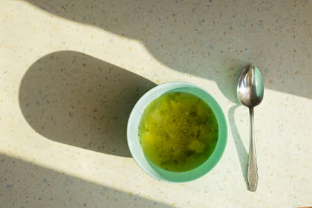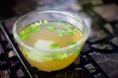 Fresh prepared asian aromatic broth soup with spring onion served on breakfast. Traditional thai cuisine made of fresh ingredients.