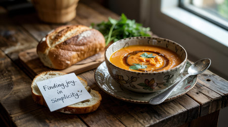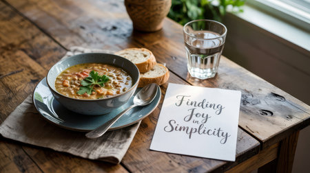 Warm bowl of soup garnished with herbs, served with bread on a rustic wooden table. A glass of water and a note with the text Finding Joy in Simplicity complete the cozy scene.