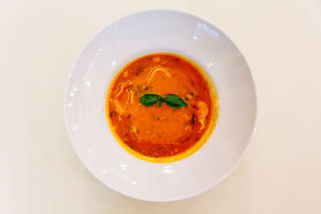 Thai Ryukyu Roe Sour Soup served in white bowl on white table.