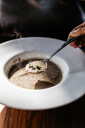 Hand scooping mushroom soup with steam and Grouton in white plate with sunlight.