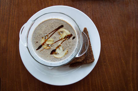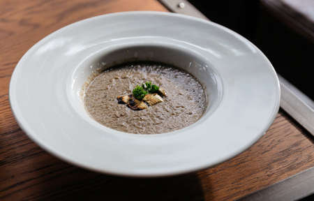 Cream soup puree with mushroom in a bowl on wooden background..Vegan food. Dietary menu. Top view.