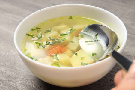 Concept of tasty food with chicken soup on gray textured background