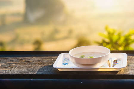 A bowl of breakfast porridge on the wooden balcony in the morning.
