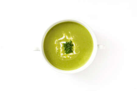Zucchini soup in bowl isolated on white background. Top view