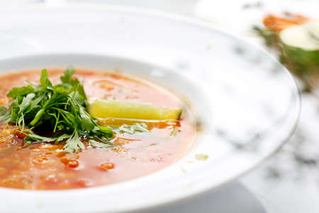 Red lentil soup with coriander and lime. A plate of aromatic and healthy soup. Lebanese cuisine. Lebanese red lentil soup with lime and coriander. A plate of aromatic and healthy soup.