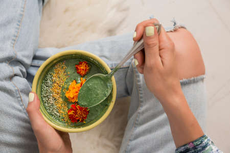 Overhead view of woman holding bowl of food garnished with flowers