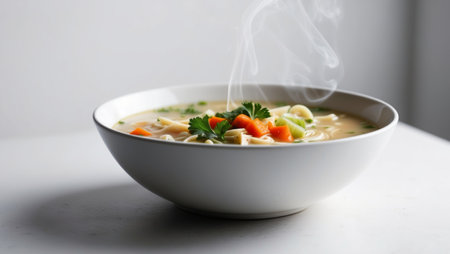 AI Generated. Chicken noodle soup garnished with parsley and vegetables