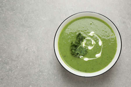 Tasty kale soup on gray table, top view. Space for text
