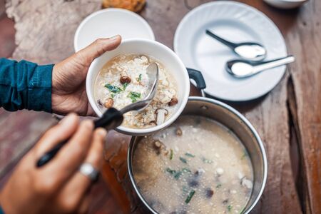 A man scooping rice soup into a bowl. Asian food in the morning.