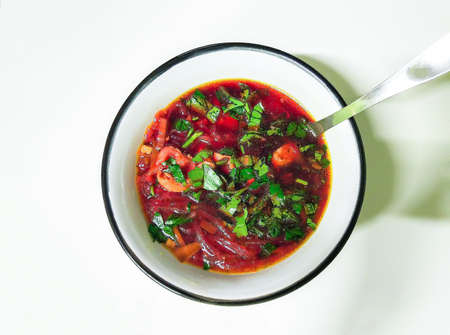 Russian and ukrainian traditional red soup borsch in a white plate on white background