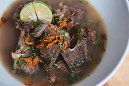 Boiled beef bone soup. White bone broth. Green onion soup