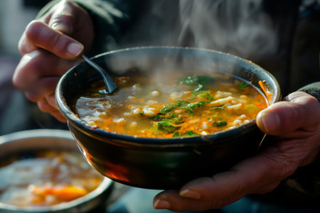 Compassion in action serving warm vegetable chowder to homeless individuals during a winter storm