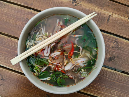 Deep plate with Vietnamese pho bo soup and chopsticks on a wooden table. Meat broth with rice noodles, hot red pepper, herbs, garlic and soy sprouts. Top view.