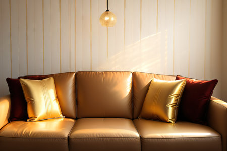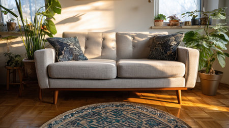 A cozy sofa adorned with soft cushions is bathed in gentle sunlight, creating a warm and inviting atmosphere perfect for relaxation in modern interiors.