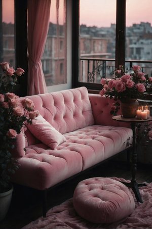 Pink Sofa on the Balcony Next to a Table, Draped with Velvet and Flowers. Urban Balcony Morning Atmosphere with Soft Candlelight